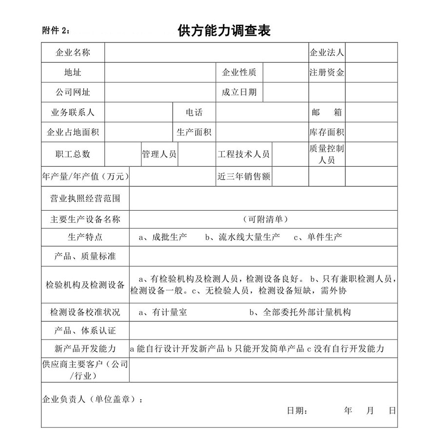 c有相关物资的生产能力,并具备一定的生产规模,如:场地、人员、生产设备、检测设备等,且如实填写《供方能力调查表》。