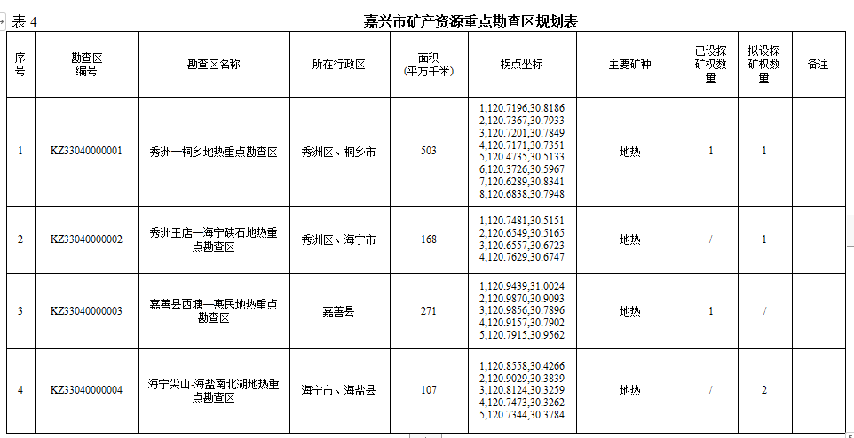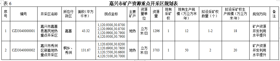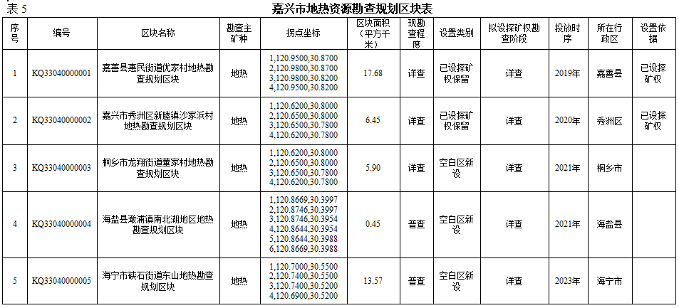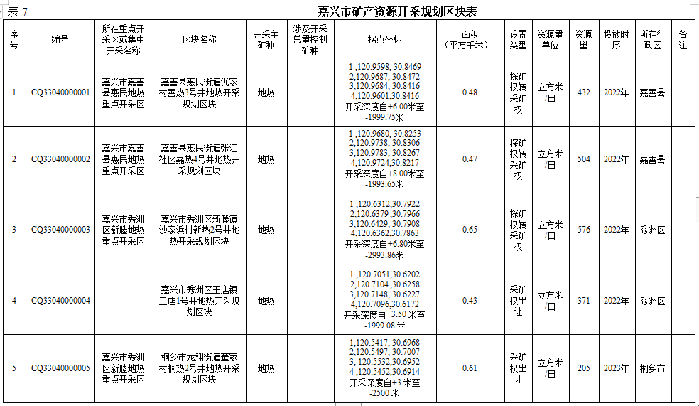 根据矿业权出让登记管理权限和矿产资源勘查成果,划定市、县两级出让登记矿种的开采规划区块,为探矿权转采矿权、登记发证和监管矿产资源开采活动提供依据,划定5个地热开采规划区块,分别为嘉善县惠民街道优家村善热3号井地热开采规划区块、嘉善县惠民街道张汇社区嘉热4号井地热开采规划区块、嘉兴市秀洲区新塍镇沙家浜村新热2号井地热开采规划区块、嘉兴市秀洲区王店镇王店1号井地热开采规划区块、桐乡市龙翔街道董家村桐热2号井地热开采规划区块。