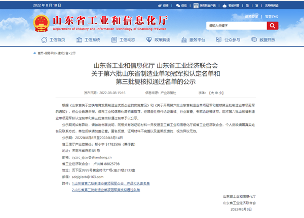 02上榜山东省制造业单项冠军产品拟认定名单