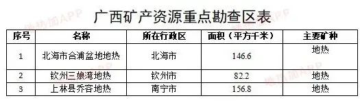 《规划》以战略性矿产、优势矿产、产业发展急需矿产为重点,划定了40个重点勘查区,其中有三个片区涉及地热资源,包括北海市合浦盆地地热、钦州三娘湾地热、上林县乔容地热,总面积达385.6平方千米。
