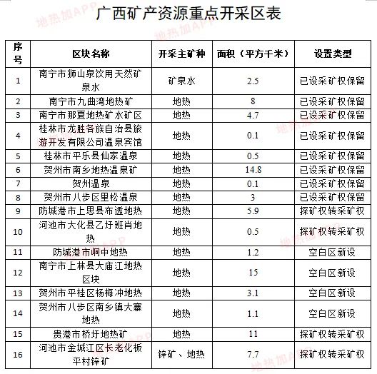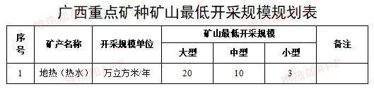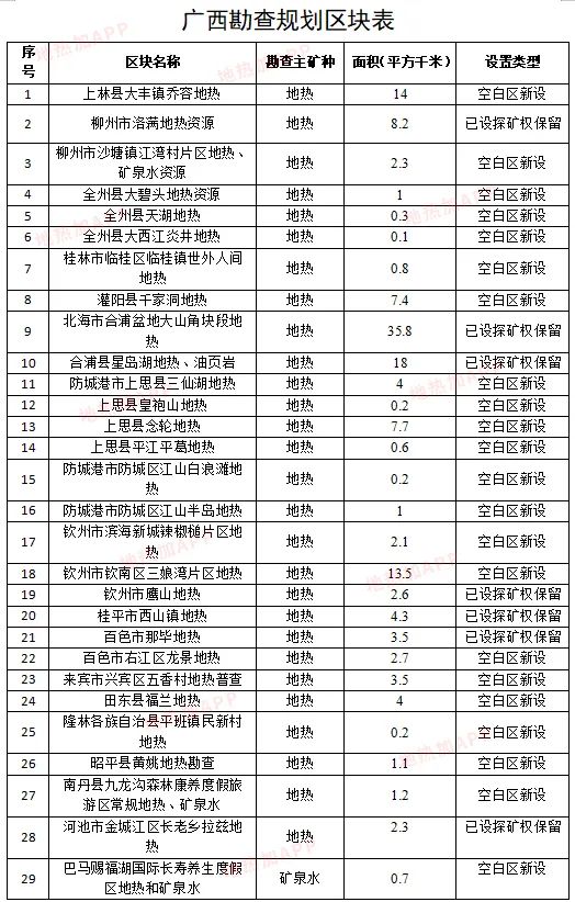 最后,《规划》以附件形式发布了广西矿产资源重点勘查区表、广西勘查规划区块表、广西矿产资源重点开采区表、广西重点矿种矿山最低开采规模规划表等,对广西矿产资源区块进行了详细的统计与划分,其中涉及大量的地热田资源。