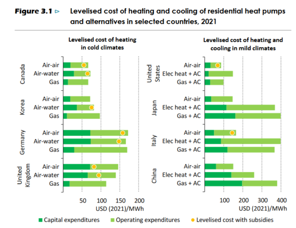 该报告指出:“根据2021年设备平均价格和燃料价格(预测)……即使没有补贴,在天气寒冷时采用新型热泵为普通家庭供暖比大多数主要供暖市场上使用天然气冷凝锅炉的成本更低。”