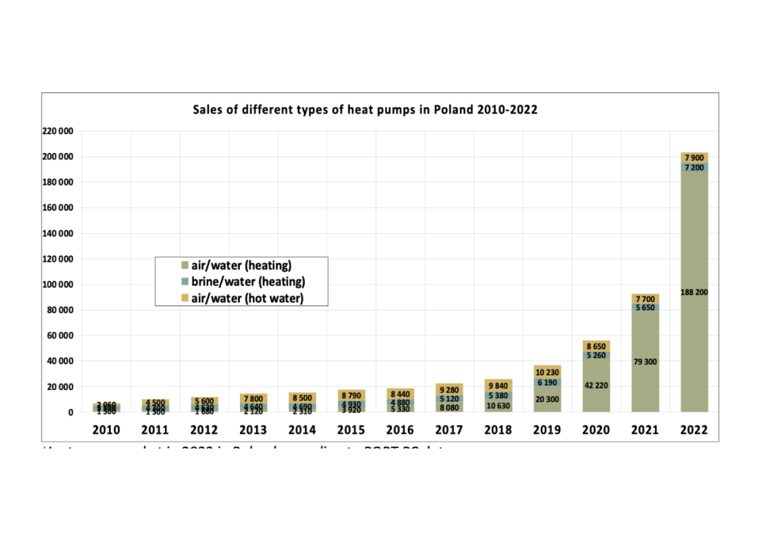 • 2022年,波兰销售的空气-水热泵数量比2021增加了137%,达到188200台。这意味着在过去10年中,波兰的空气-水热泵市场增长了100多倍。