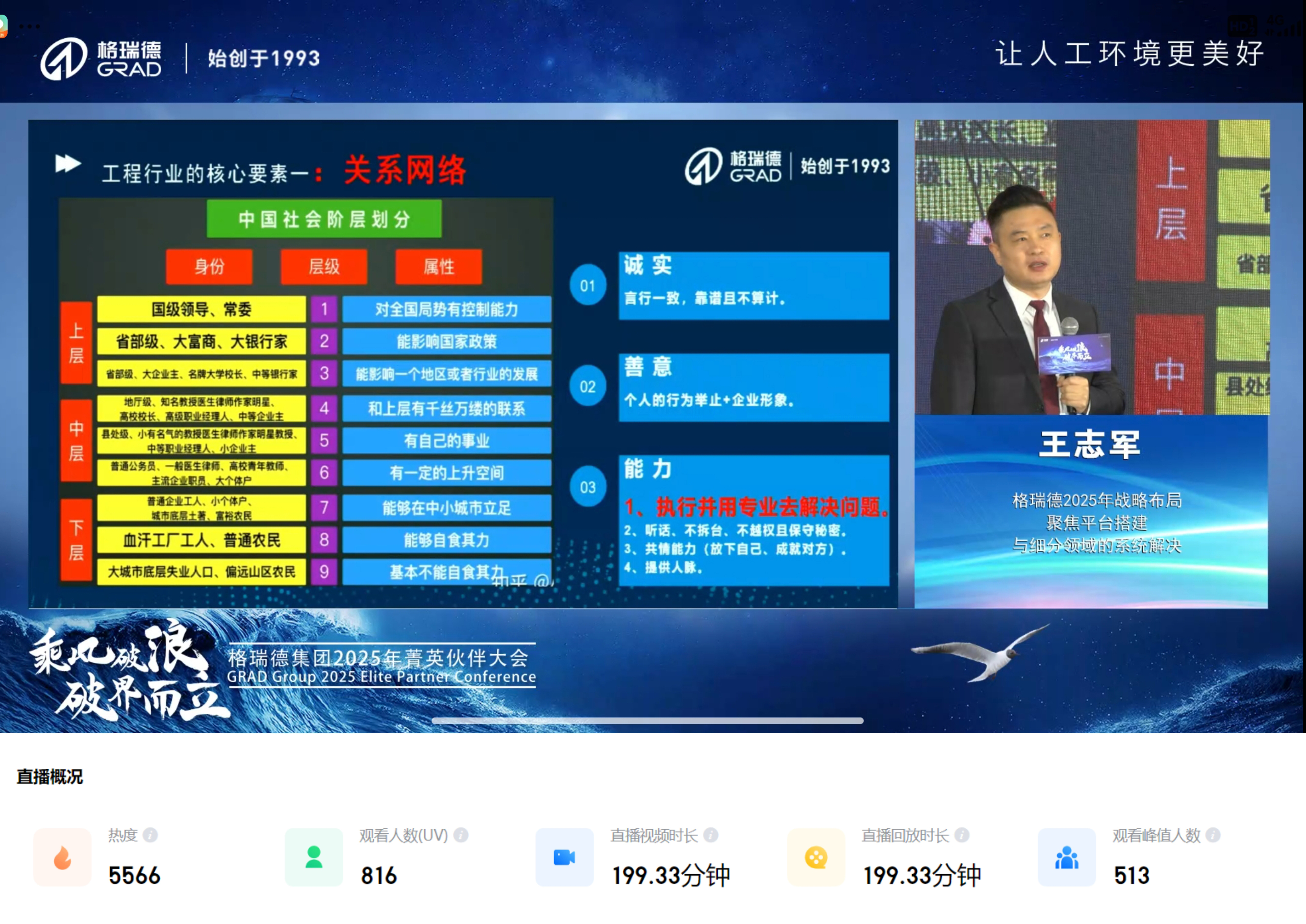 集团总经理王志军表示,格瑞德人就是航行于汪洋大海的舵手,乘风破浪,勇往直前。积极寻找突破和创新,应对各种风险和挑战,实现新的发展和跨越。同时他深度解读了2025年的战略规划,蓝图宏伟且目标清晰。他着重强调了公司在研发创新、市场拓展以及客户服务等方面的全面升级,旨在通过全方位的努力,推动公司战略目标的稳步实现。王总表示,“以德为基、以人为本、顾客至上”始终是格瑞德集团及全体职工的核心价值观,其中顾客至上源于持续输出优质的产品、提供优质的服务,让客户感受到完美的客户体验。同时王总综合分析目前经济环境、行业趋势等情况,引导各位菁英2025年业务发力重点,为行业可持续发展输入强劲的动力。