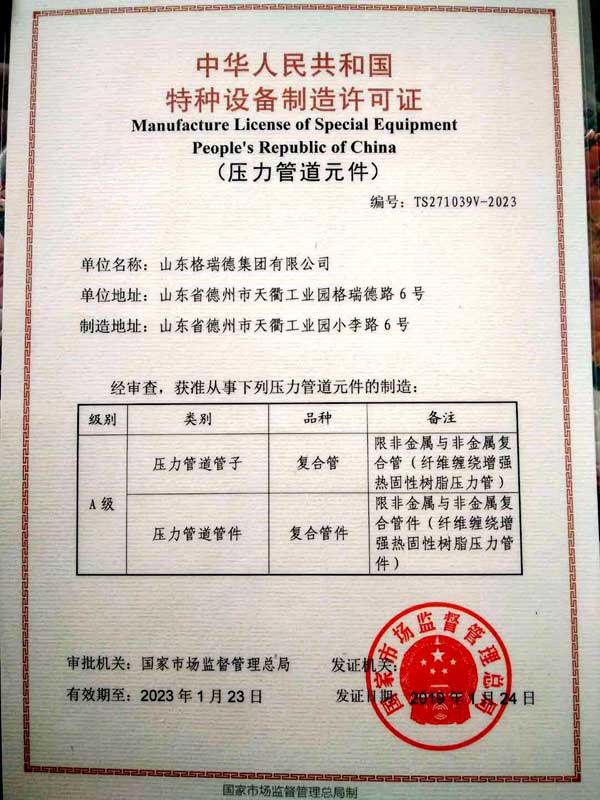 2018年7月,根据当前玻璃钢管道工程的承揽需求,格瑞德集团缠绕公司董作军总经理提出办理压力管道元件特种设备制造许可证的要求,自2018年7月31日正式向国家市场监督管理总局提交许可申请书到2019年1月24日正式发证,历经6个月。6个月的时间里,在缠绕公司各个部门通力合作、集团公司相关部门的大力支持下,顺利完成了特种设备质量保证手册、特种设备程序文件、相关作业文件、相关管理制度的编制工作;完成了产品的试制及实验工作;并于2018年11月15日至16日顺利通过中国工业防腐蚀技术协会的现场审核工作。
