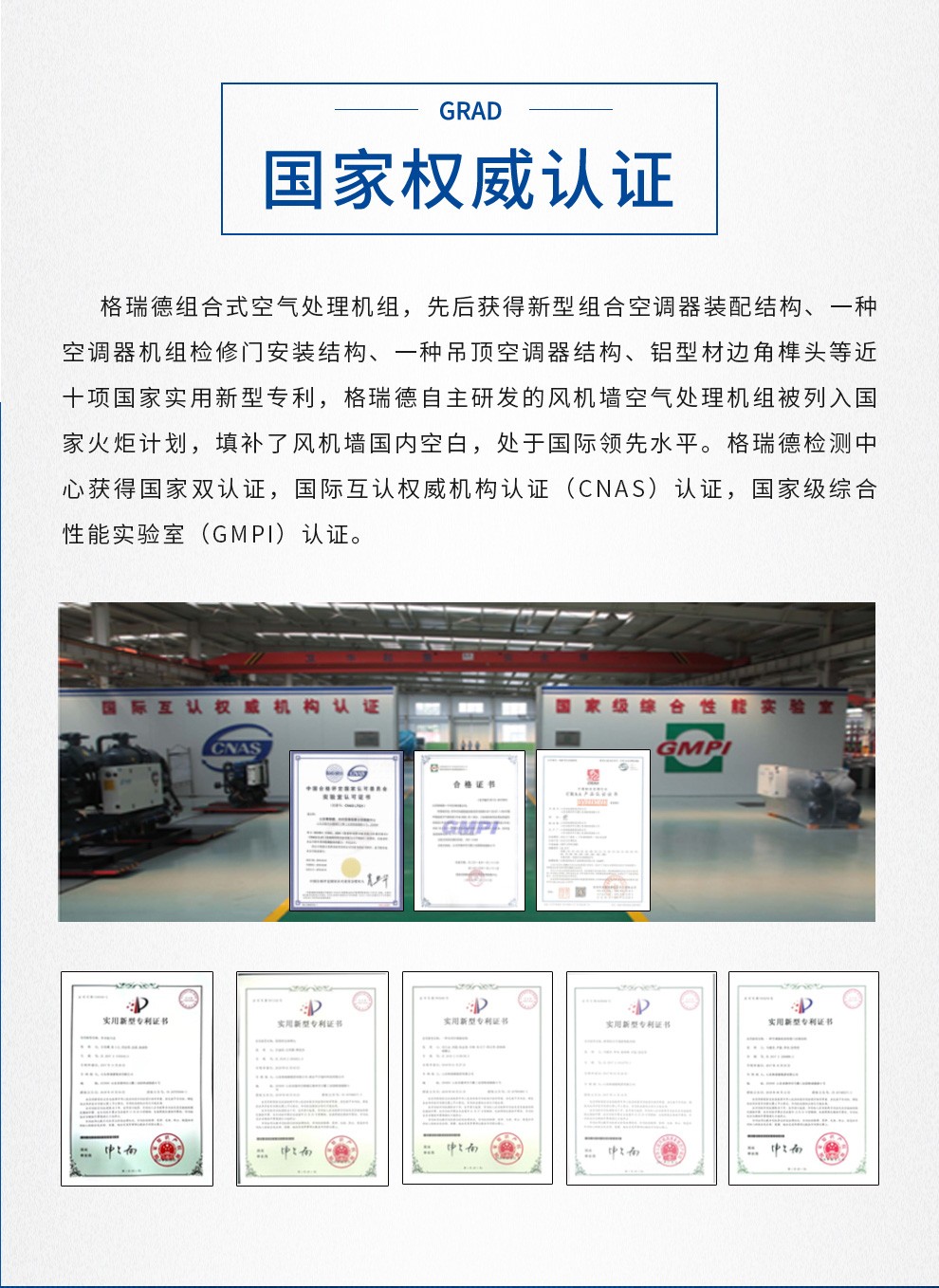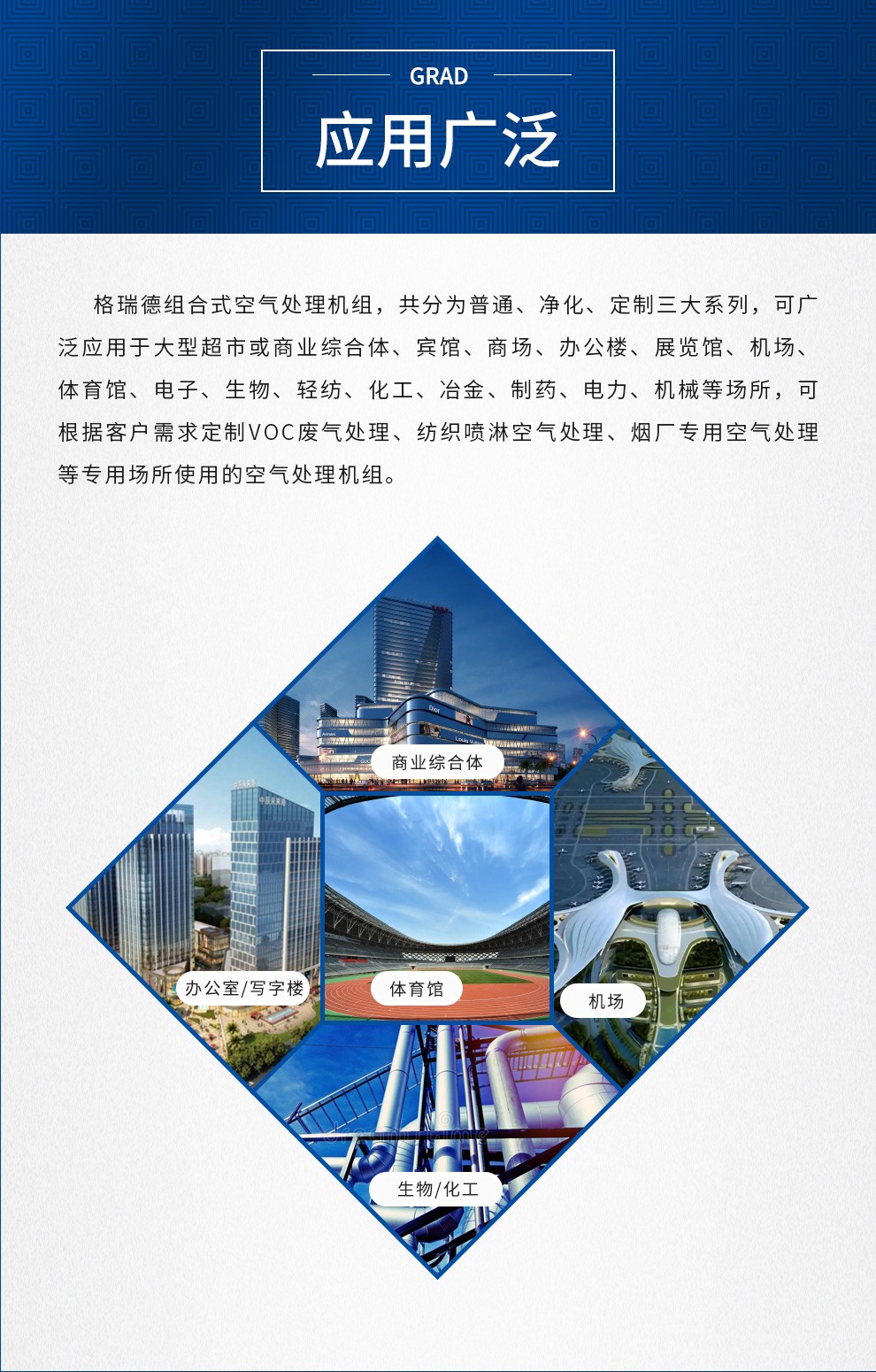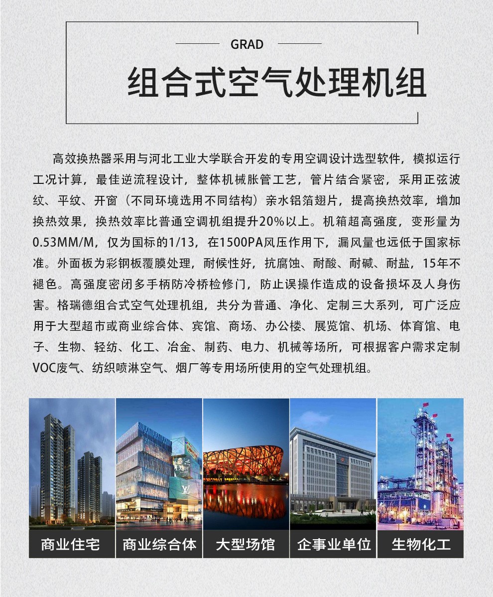 格瑞德致力于让人工环境更美好,通过打造空调工程、通风人防、复合材料、环保工程领域的全过程解决方案来满足客户需求,格瑞德构建了包括品牌规划、系统设计、技术开发、产品制造、整体施工、维护服务、检测认证、人才交流、产业集群的全生命周期产业链和产业生态。